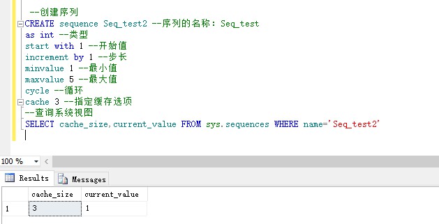 我们还可以为Sequence指定缓存选项,使得减少IO,比如,我们指定Cache选项为3,则当前的Sequence由1增长过3后,SQL Server会再分配3个空间变为从4到6,当分配到7时,SQL Server继续这以循环,如果不指定Cache值,则值由SQL Server进行分配。一个简单的例子如图所示。