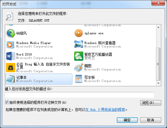 一旦你在\MSSQL\LOG目录里,对于SQL Server和SQL Server代理,你都会看到很多日志文件,原先的日志文件(只要正常启动服务,每次都会创建)也在目录里。SQLAGENT.OUT文件是SQL Server代理的当前日志文件,因此这是你要打开的文件。默认情况下,当你尝试打开这个文件时,你需要选择打开这个后缀为.OUT文件的默认程序。记事本就可以,当你有另一个喜好,你可以选择这个扩展文件名的文本查看器(如图2所示,选择记事本)。