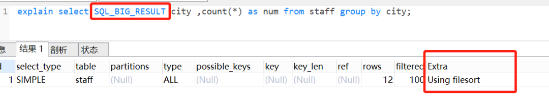 因此,如果预估数据量比较大,我们使用SQL_BIG_RESULT 这个提示直接用磁盘临时表。MySQl优化器发现,磁盘临时表是B+树存储,存储效率不如数组来得高。因此会直接用数组来存