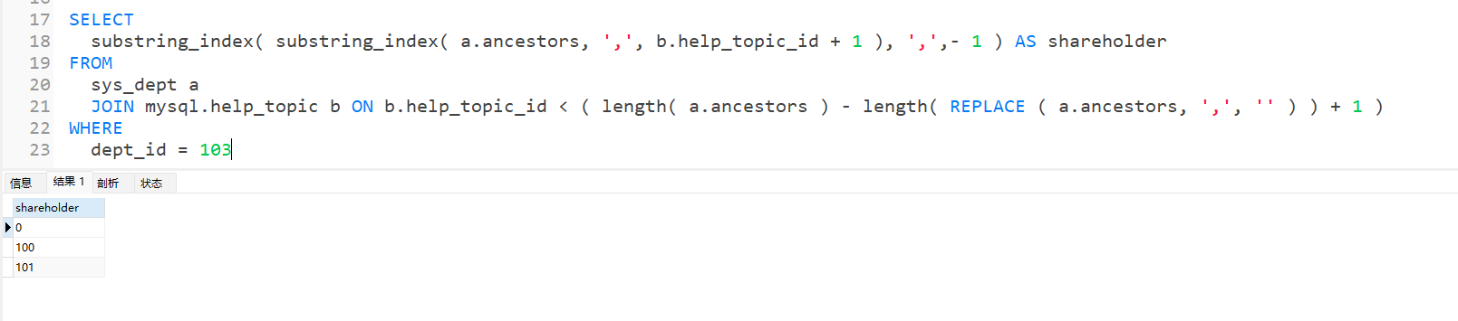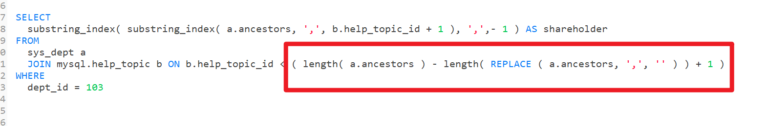 substring_index( substring_index( a.ancestors, ‘,’, b.help_topic_id + 1 ), ‘,’,- 1 ) AS shareholder