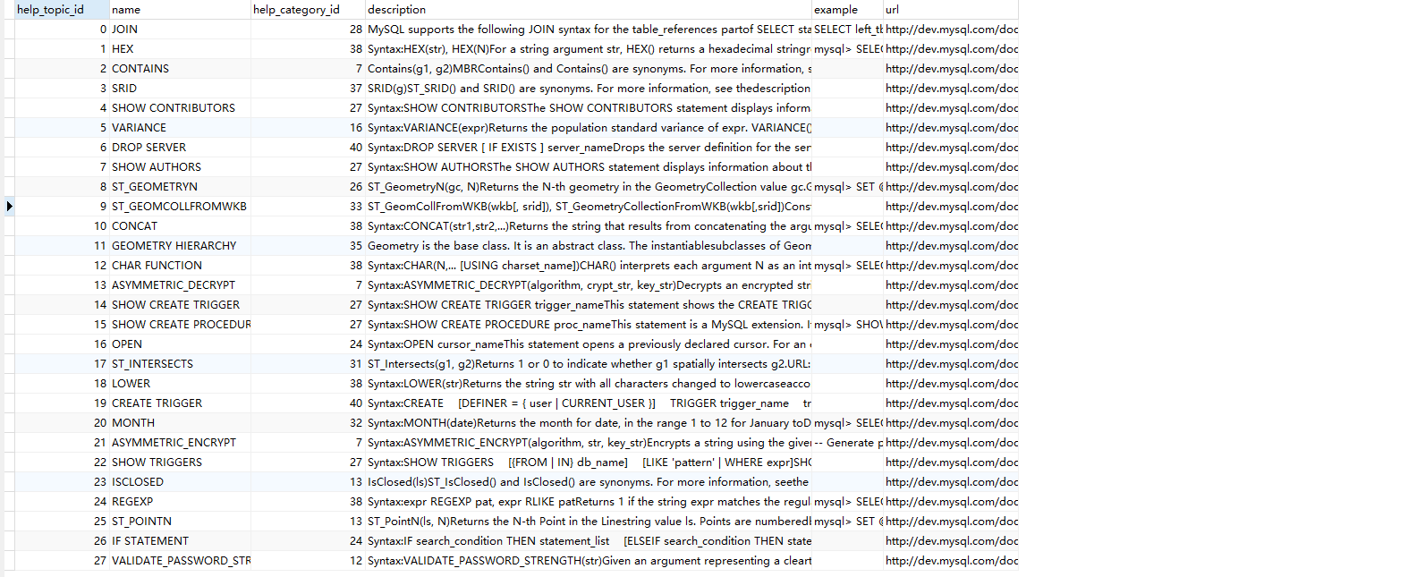 那么我们假设现在是第一行,mysql.help_topic表中的help_topic_id为0