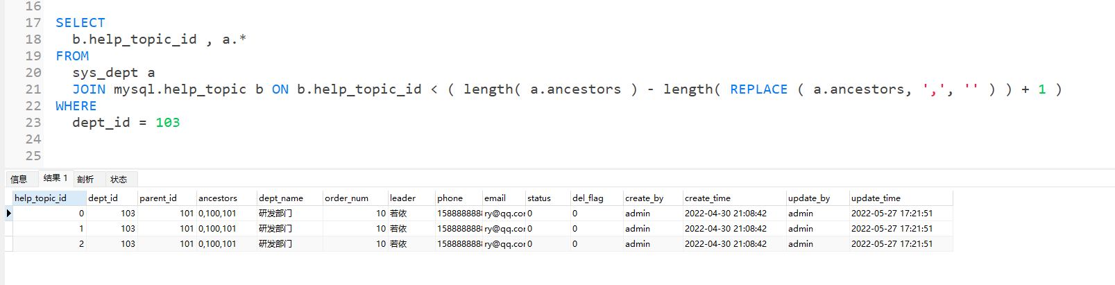 例如我查询dept_id为103的所有祖先节点,现在我只有一个dept_id该怎么查