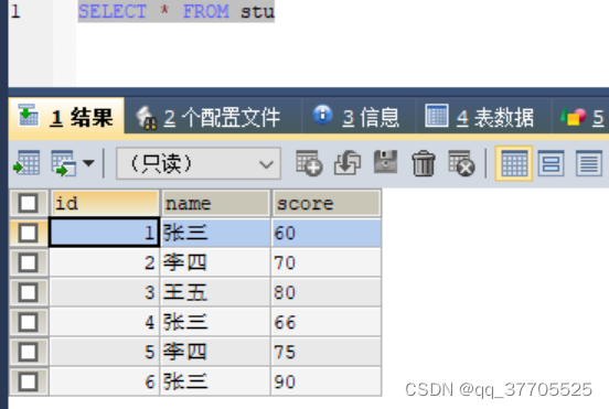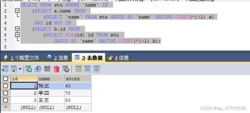 SQL中去除完全相同数据可以用distinct关键字,任意字段去重可以用group by,以下面的数据表为例。