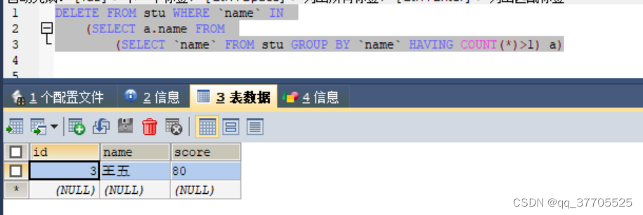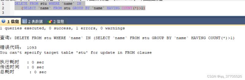 原因是:不能将直接查处来的数据当做删除数据的条件,我们应该先把查出来的数据新建一个临时表,然后再把临时表作为条件进行删除功能