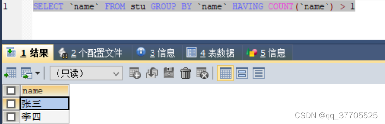 SELECT `name` FROM stu GROUP BY `name` HAVING COUNT(`name`)>1
