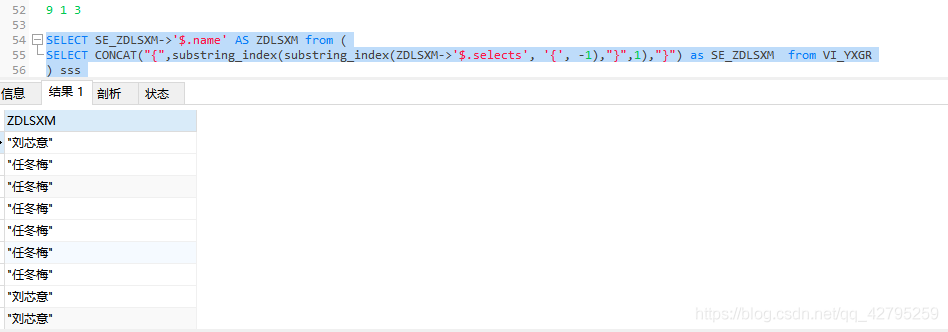在这个基础上,再取下一层,由于这层是动态的key,不能使用第一步的 ZDLSXM->'$.selects' 那种方法,所以我选择substring_index 方法 去掉大括号的方式来,再使用CONCAT() 拼接成为新的json,如下图标红的地方删除掉