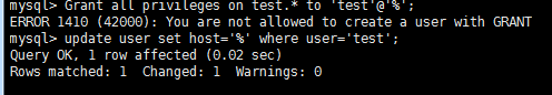 于是修改host:update user set host='%' where user='test';