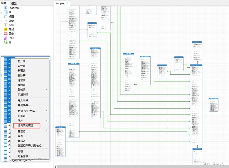 - 结束后,想要那些表之间的关系图,只需要选中后逆向表到模型即可得到需求中的效果