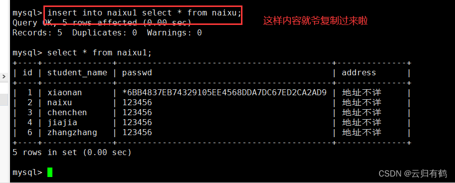 insert into test03 values(1,’hehe’,12345,’看美女’);