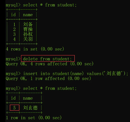 在 InnoDB 引擎中,使用了 delete 删除所有的数据之后,并不会重置自增列为初始值,我们可以通过以下命令来验证一下: