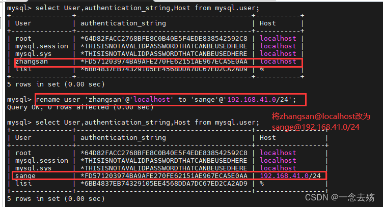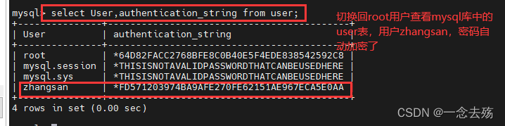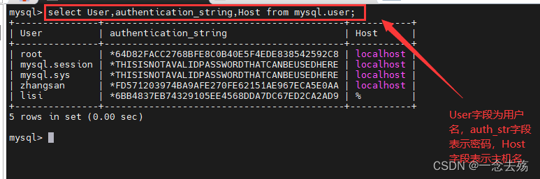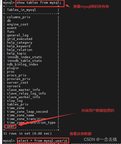 查看mysql库中的user表,强调一点,这个库只有root用户能查看,普通用户是没有权限查询这个库的。