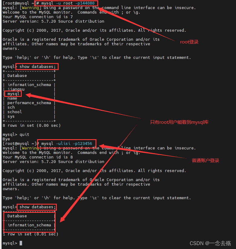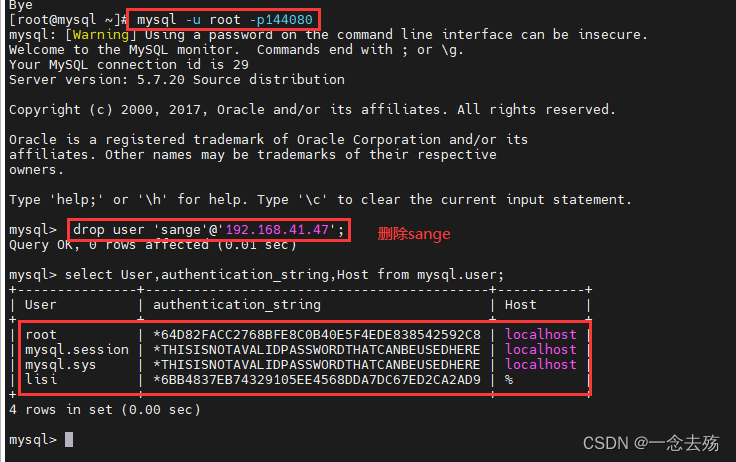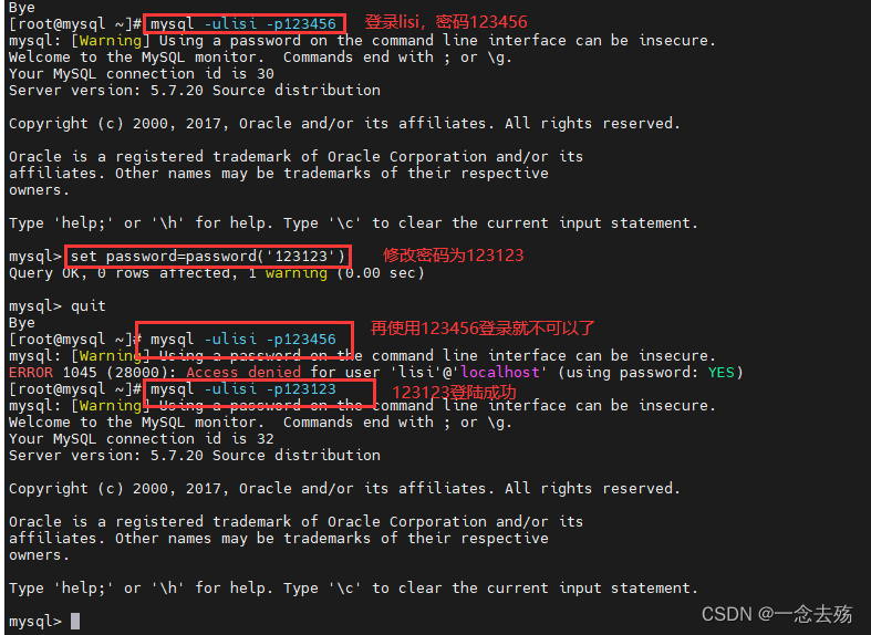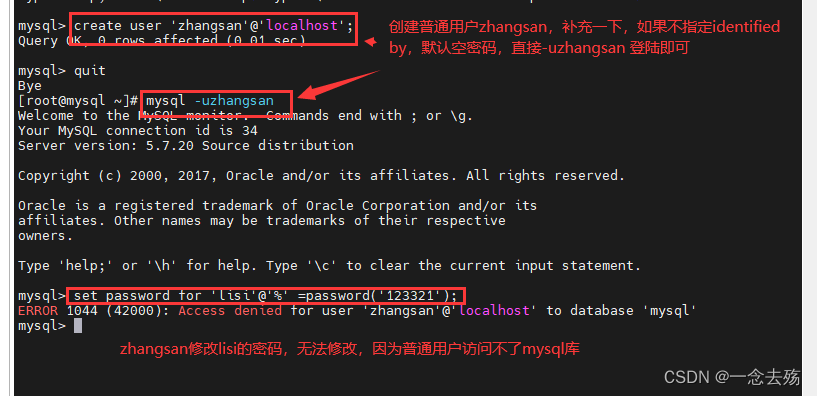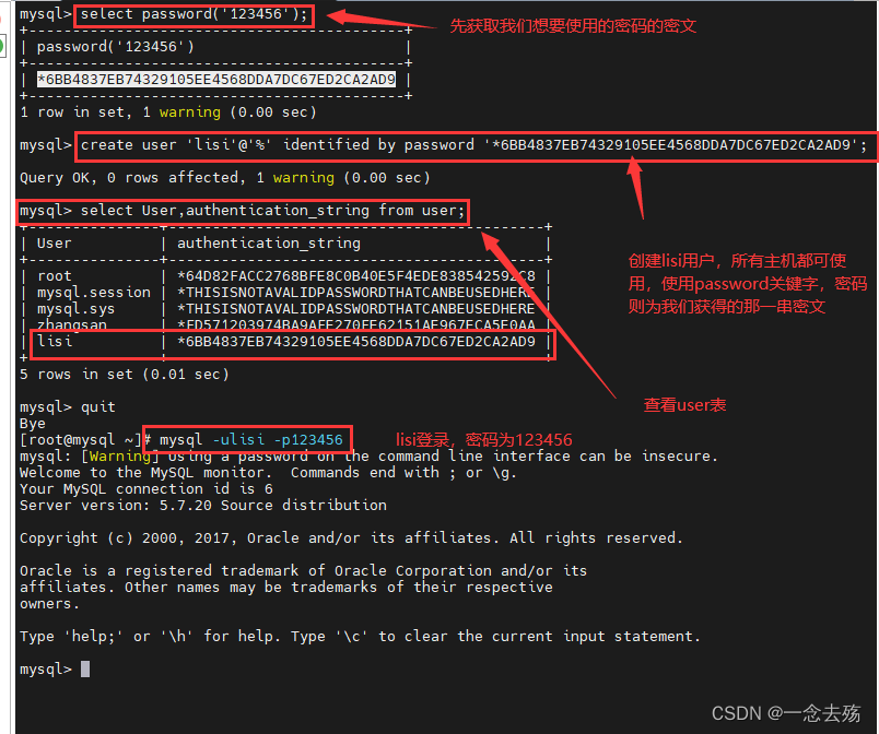- 若使用明文密码,直接输入’密码’,插入到数据库时由Mysql自动加密;若使用加密密码,需要先使用SELECT PASSWORD(‘密码’); 获取密文,再在语句中添加 PASSWORD ‘密文’;若省略“IDENTIFIED BY”部分,则用户的密码将为空。
