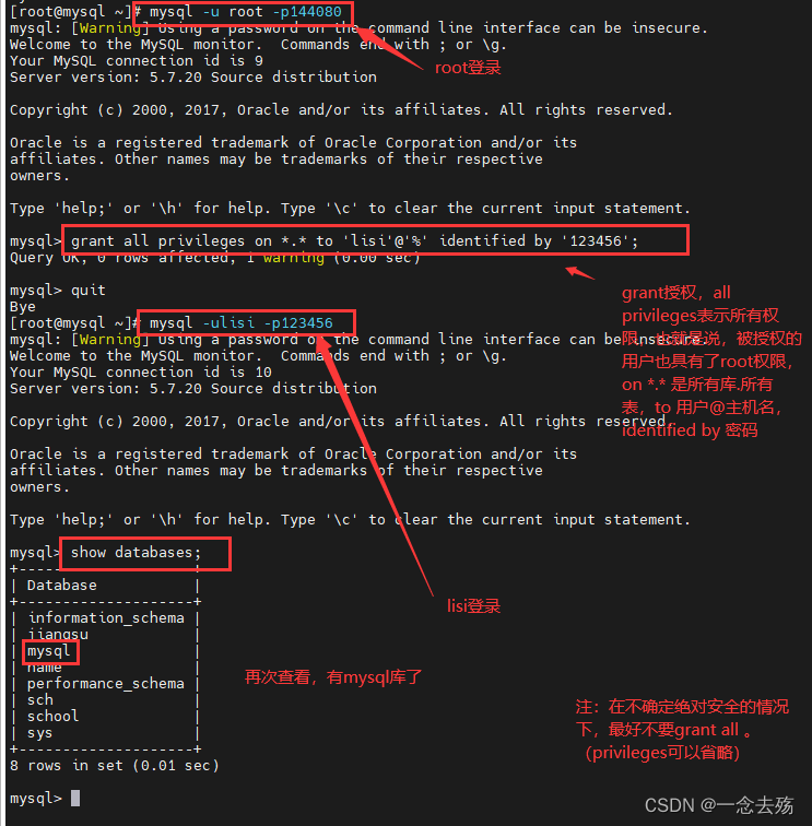 如果我们想要让某一普通用户可以查看这个mysql库,需要使用grant进行授权。注意,授权工作也只能在root用户执行。