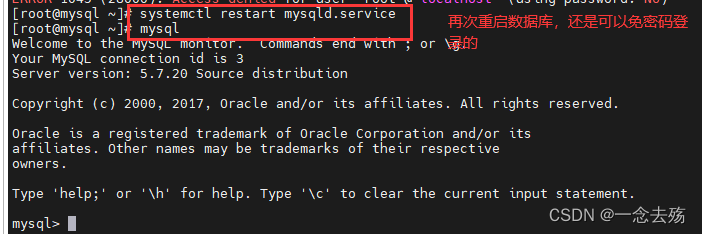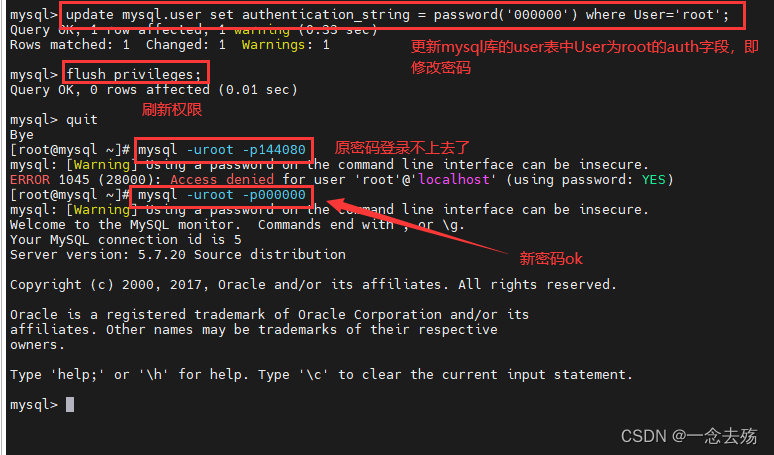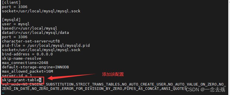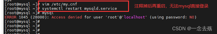切记:修改完后一定将配置文件的skip-grant-tables注释或者删掉,不然再执行一次重启数据库,还是可以无密码登录,很危险
