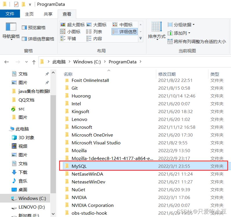 3.在我们之前安装 MySQL 的地方检查有没有残留的文件 , 并将其手动删除.(我是默认c盘的)