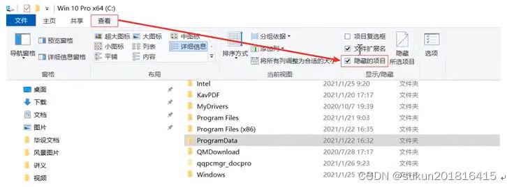 这里如果找不到programData,就说明你的是隐藏文件,这里就需要点击“查看”,然后勾选“隐藏的项目”。