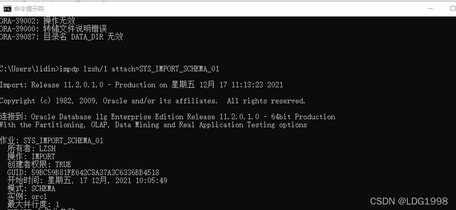 impdp 刚刚作业导入的用户名/密码 attach=SYS_EXPORT_SCHEMA_01