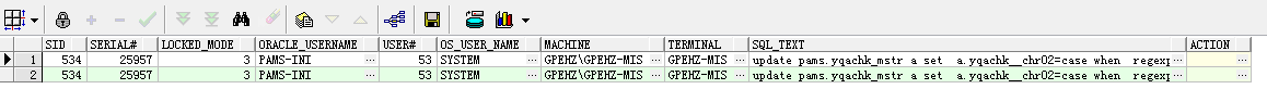 2、查出锁定表的session的sid, serial#,os_user_name, machine name, terminal和执行的语句,比上面那段多出sql_text和action