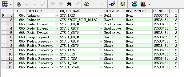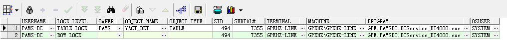 4、这个语句将查找到数据库中所有的DML语句产生的锁,还可以发现,任何DML语句其实产生了两个锁,一个是表锁,一个是行锁。
