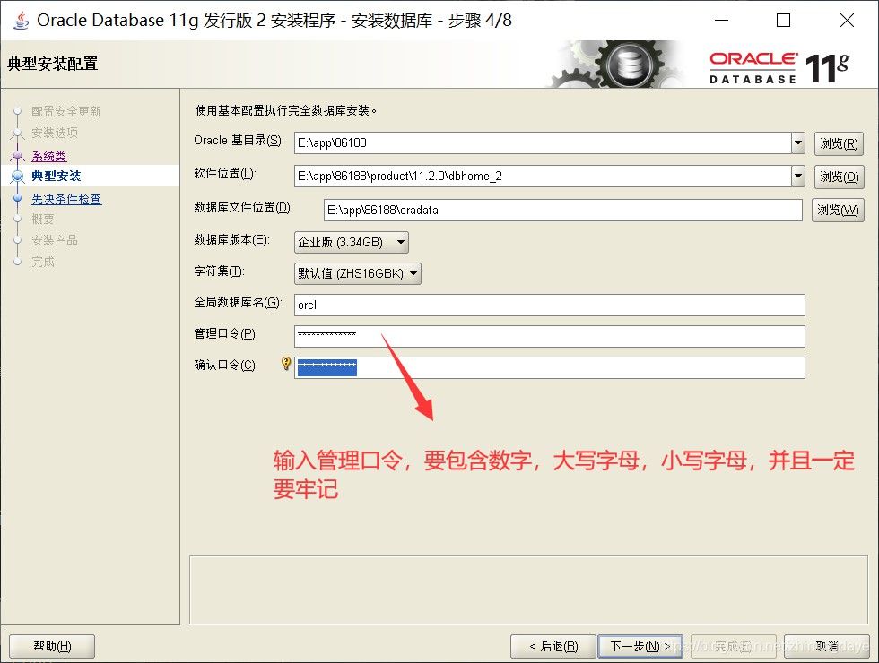7 选择你要安装的位置,然后设置一个密码,这个密码一定要记住,后面你使用Oracle的时候会经常用到。
