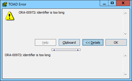 Names for tables, clusters, views, indexes, synonyms, tablespaces, and usernames must be 30 characters or less. You must shorten the name to no more than 30 characters for these objects.