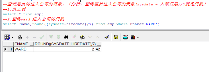 范例:查询雇员的进入公司的周数。(分析:查询雇员进入公司的天数(sysdate – 入职日期)/7就是周数)