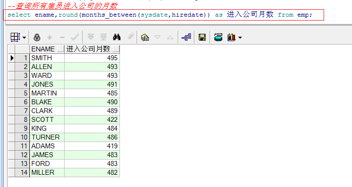 select ename,round(months_between(sysdate,hiredate)) as 进入公司月数 from emp;