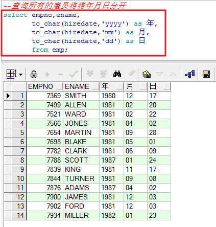范例:查询所有的雇员将将年月日分开,此时可以使用 TO_CHAR 函数来拆分