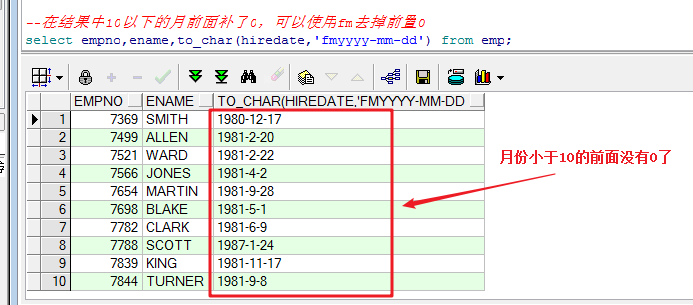 select empno,ename,to_char(hiredate,’fmyyyy-mm-dd’) from emp;