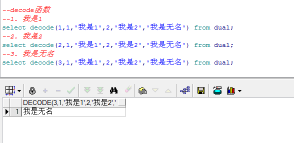 select decode(3,1,’我是1′,2,’我是2′,’我是无名’) from dual;