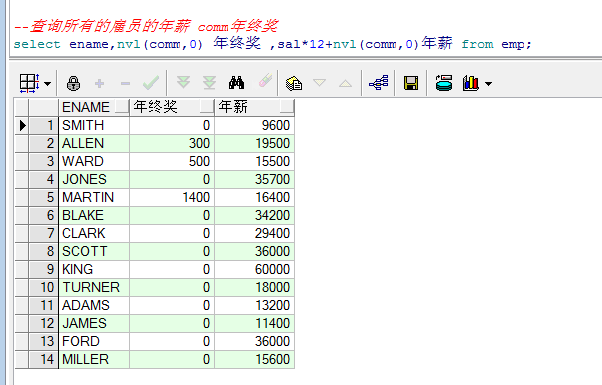 select ename,nvl(comm,0) 年终奖 ,sal*12+nvl(comm,0)年薪 from emp;