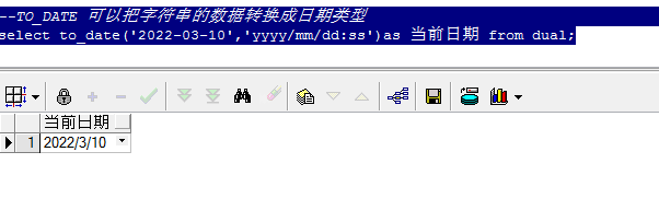 select to_date(‘2022-03-10′,’yyyy/mm/dd:ss’)as 当前日期 from dual;