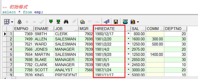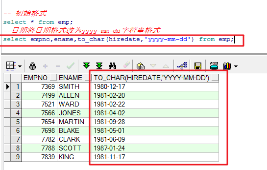 select empno,ename,to_char(hiredate,’yyyy-mm-dd’) from emp;