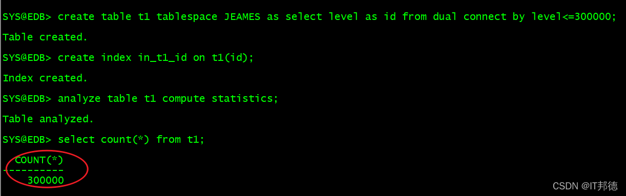 create table t1 tablespace JEAMES as select level as id from dual connect by level<=300000;