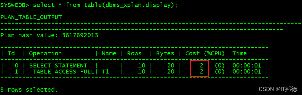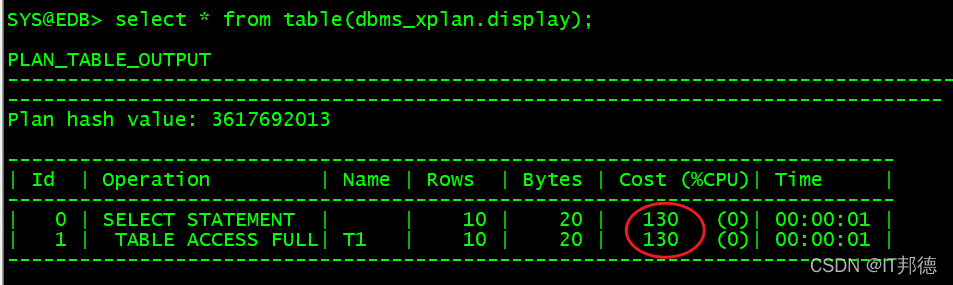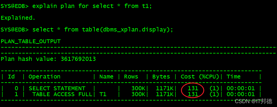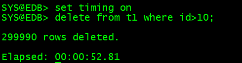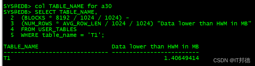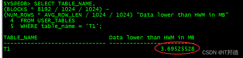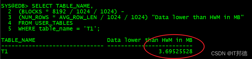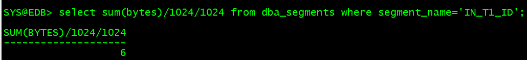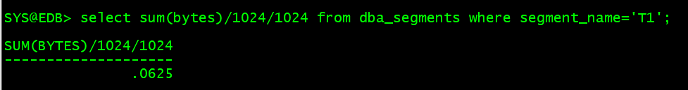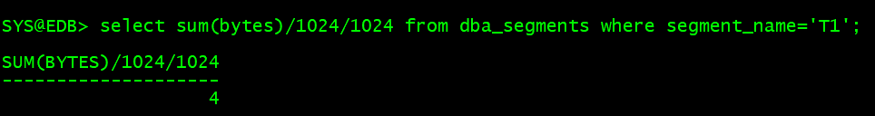 SYS@EDB> select sum(bytes)/1024/1024 from dba_segments where segment_name=‘T1′