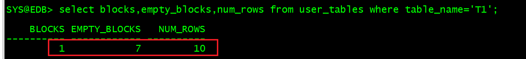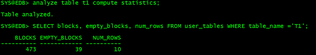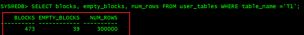 SELECT blocks, empty_blocks, num_rows FROM user_tables WHERE table_name =‘T1′;