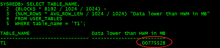 (NUM_ROWS * AVG_ROW_LEN / 1024 / 1024) “Data lower than HWM in MB”