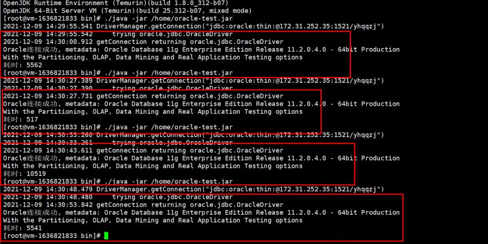 3、写了个JDBC测试程序,放在宿主机进行JDBC连接Oracle数据库测试,发现连接耗时不稳定,时快时慢,下图为宿主机连接数据库耗时截图;