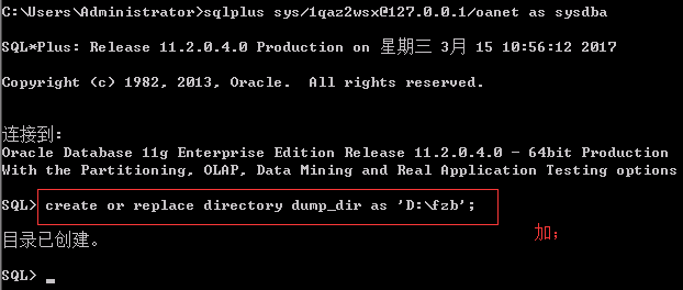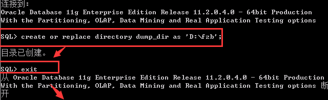 (2)创建目录对象,如:create or replace directory dump_dir as ‘D:\fzb’;(以管理员账号登录创建)