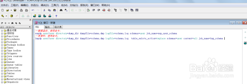 expdpuser/userdirectory=dump_dirdumpfile=schema.dmplogfile=schema.logschemas=userjob_name=exp_user_schema恢复时,使用命令:impdpuser/userdirectory=dump_dirdumpfile=schema.dmplogfile=schema.logtable_exists_action=replaceschemas=usercontent=alljob_name=imp_schema