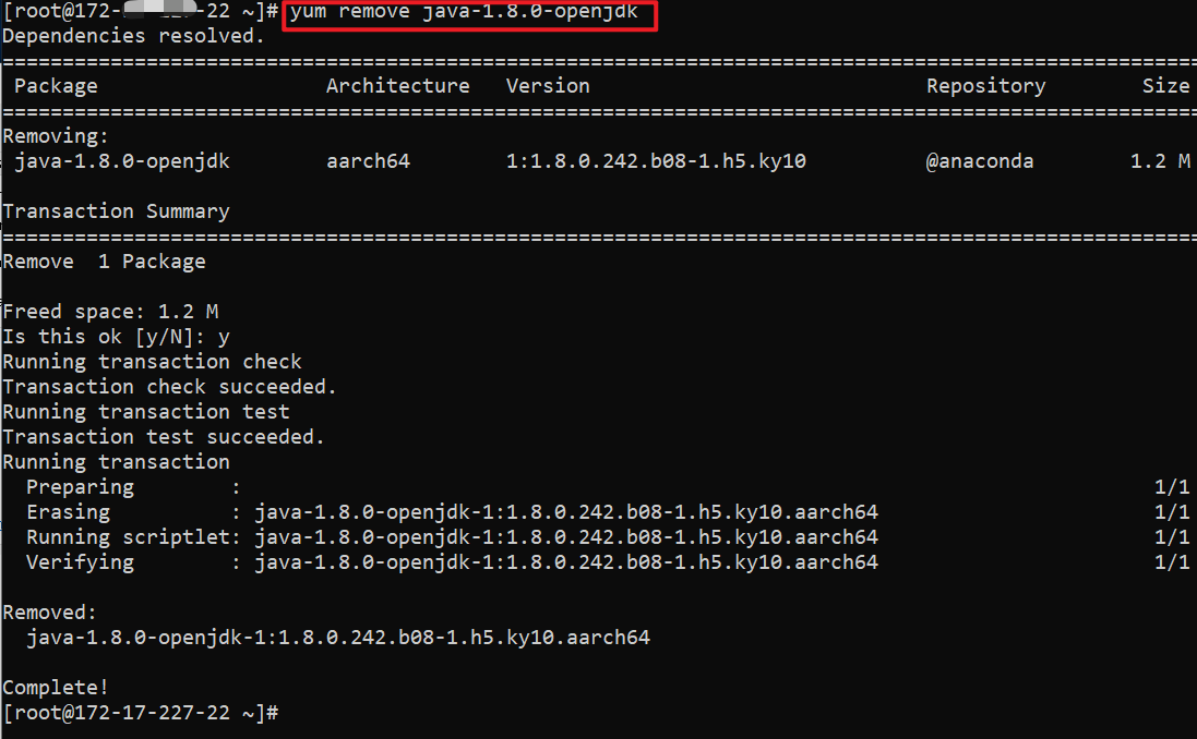 yum remove java-11-openjdk-1:11.0.6.10-4.ky10.ky10.aarch64