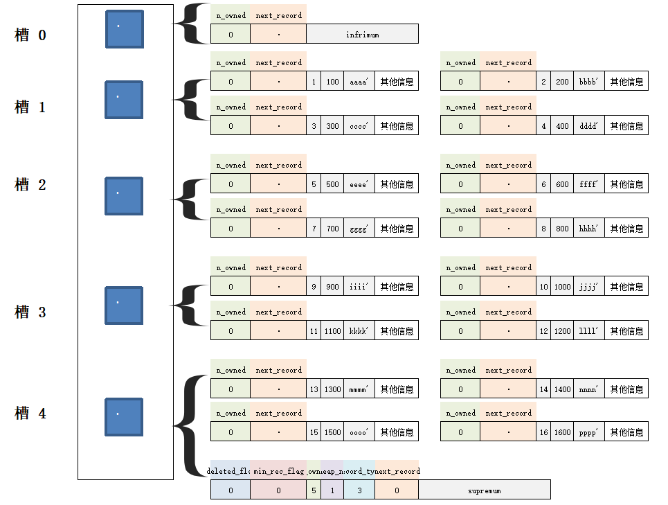 - 每个组内最后一条记录(也就是最大的那条)就是“大哥”,其他记录都是“小弟”,而“大哥”记录的头信息中的 n_owned 属性表示该组内共有几条记录。