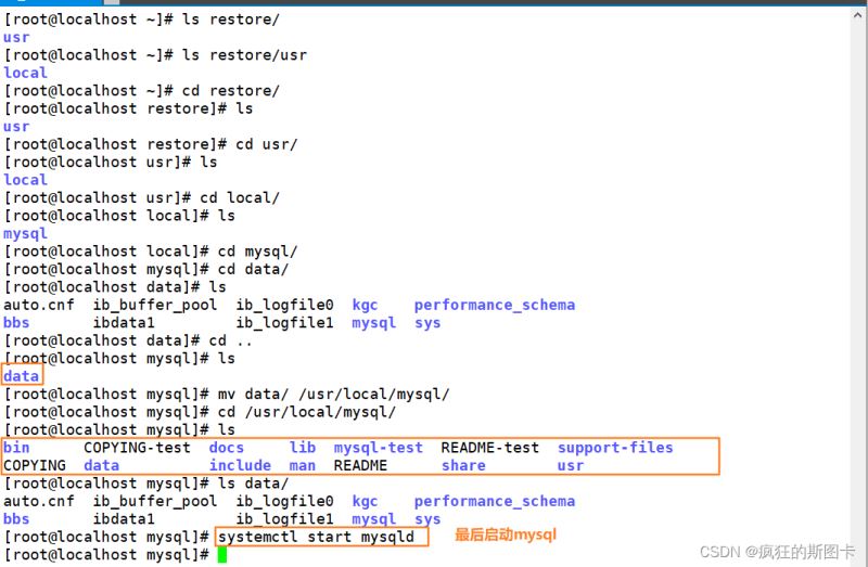 mv /usr/local/mysql/data/ /bak/ ##模拟数据库丢失