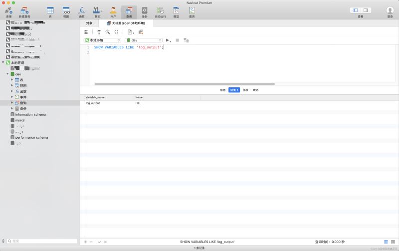 SHOW VARIABLES LIKE ‘log_output’;