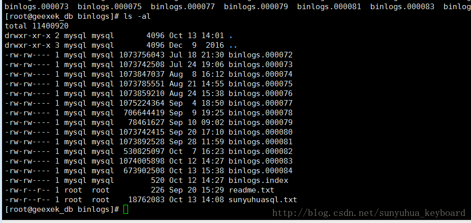 2、进入日志所在目录 cd /home/mysql/logs/binlogs, 输入ls -al 查看需要查看的binlogs产生的时间。