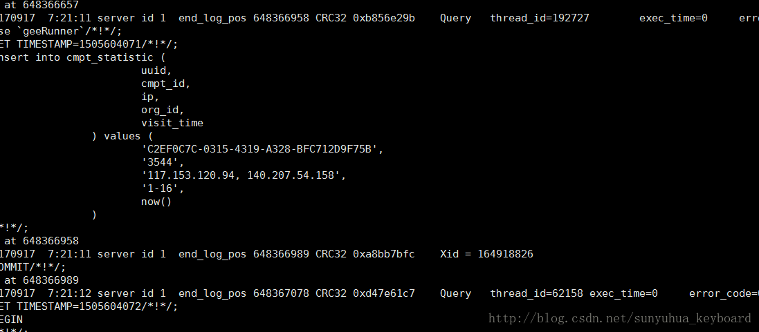 mysqlbinlog –no-defaults –database=geeRunner –start-datetime=”2017-09-17 07:21:09″ –stop-datetime=”2017-09-19 07:59:50″ binlogs.000080 > sanjiaomao.txt