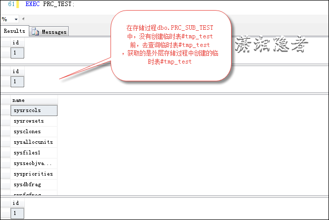 此时只要先我执行一次存储过程dbo.PRC_SUB_TEST,然后再去执行存储过程dbo.PRC_TEST就不会报错了。而且只要执行过一次这个存储过程,然后在当前会话或其它任何会话执行dbo.PRC_TEST都不会报错了。是否非常让人迷惑或不解。