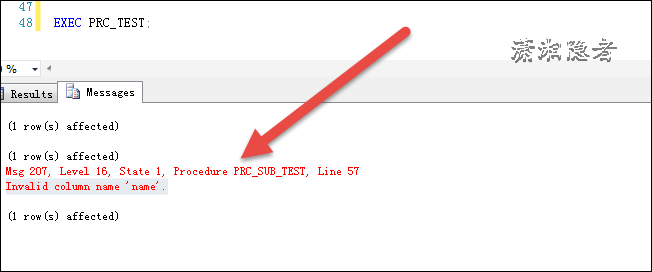 简单测试似乎正常,并没有发现什么问题。如果此时你就下一个结论的话,那么就为时过早了! 打个比方,你看见一只天鹅是白色的,如果你下了一个定论:“所有天鹅都是白色的”,其实这个世界真的有黑天鹅,只是你没有见过而已!如下所示,我们修改一下存储过程dbo.PRC_SUB_TEST,使用字段名name替换*,如下所示: