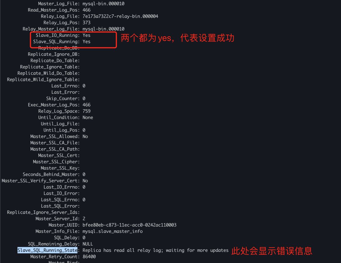 配置过程中可能会出现一些错误,利用 show slave status\G 可以查看具体错误信息,不过也有可能出现命令操作太快,还未链接成功的情况。本人还遇到过主的账号(slave账号)需要在主的服务器登录一次,从服务器才能链接成功的情况,暂时不确定什么原因,有知道的可以留言,非常感谢