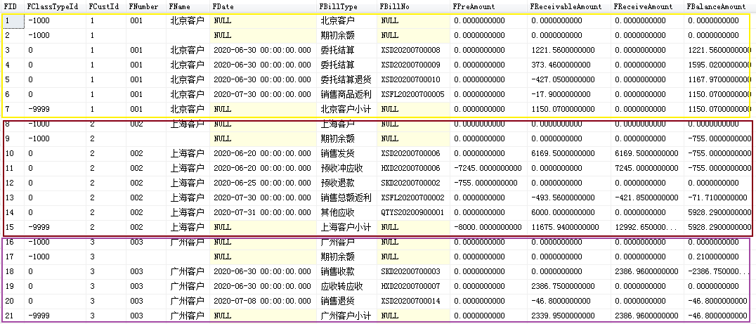 代码说明:创建了一个临时表,使用游标遍历我们的DetailData数据表,为了呈现我们最终需要的数据样式,插入客户空行、期初余额、单据信息、客户小计等,逐行计算期末余额值的情况,最终效果如下: